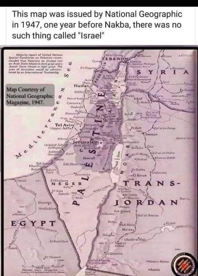 1888ல் இருந்து வெளிவரும் NATIONAL GEOGRAPHY பத்திரிக்கை 1947ல் வெளியிட்ட பாலச்தீனத்தின் வரைபடத்தில் இஸ்ரேல் என்கிற நாடும் இல்லை அப்படி ஒரு சொல்லும் அன்று இல்லை.