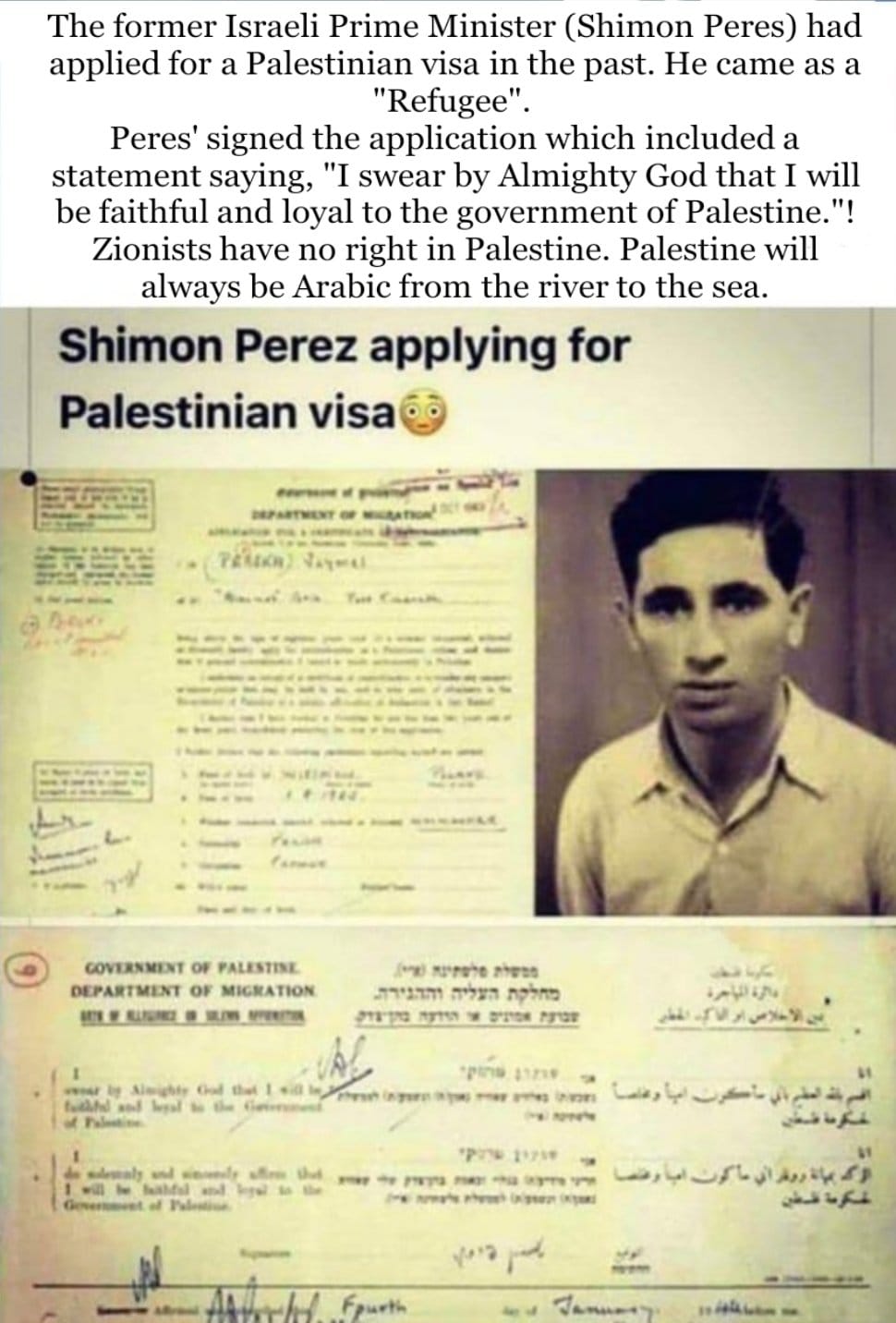 1948ம் ஆண்டுக்கு முதல் ஐரோப்பிய பரதேசியும், முன்னால் இஸ்ரேலிய அதிபருமான சைமன் பெரேஸ், பலஸ்தீன அரசிடம், அல்லாஹ்வின் மீது சத்தியம் செய்து, அந்த வாக்குறுதியில் “தாம் ஒருபோதும், பலஸ்தீன் தேசத்திற்கு துரோகம் இழைக்க மாட்டேன்” என ஒப்பமிட்டுப் பெற்றுக் கொண்ட, பலஸ்தீன் குடியுரிமைப் பத்திரம்.