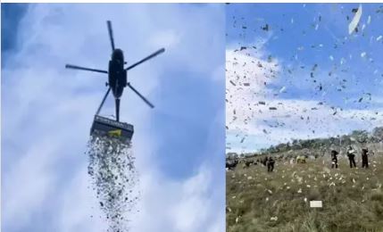அவர் சொன்னதுபோன்று, சரியான நேரத்திற்கு அந்த இடத்திற்கு வந்து ஹெலிகாப்டர் மூலம் பணத்தை வீசினார். அங்கு வந்திருந்தவர்கள் அந்த பணத்தை எடுத்துச் சென்றனர்.இது தொடர்பான வீடியோ வைரலாகி வருகிறது.