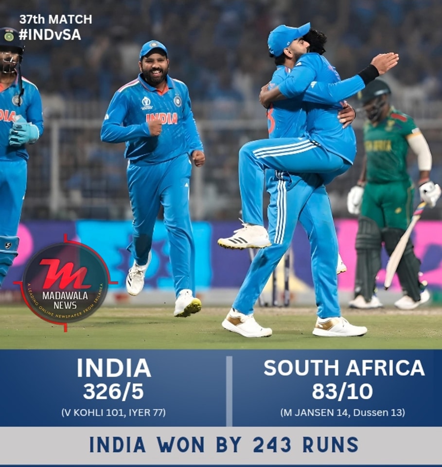 இந்நிலையில், 327 ஓட்டங்கள் என்ற வெற்றி இலக்கை நோக்கி துடுப்பெடுத்தாடிய தென்னாபிரிக்க அணி 27 ஓவர்கள் நிறைவில் சகல விக்கெட்டுக்களையும் இழந்து 83 ஓட்டங்களை மாத்திரம் பெற்று தோல்வியை தழுவியது.