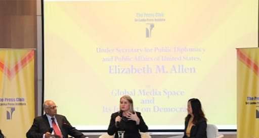 ஜனநாயக சமூகங்களில் ஊடகங்களின் இன்றியமையாத வகிபாகம் தொடர்பில் அவதானம் செலுத்தி கொழும்பில் இலங்கை பத்திரிகை ஸ்தாபனத்தினால் ஏற்பாடு செய்யப்பட்டிருந்த கூட்டமொன்றில் கலந்துகொண்ட ஊடகவியலாளர்கள், சிவில் சமூகத்தினர் மற்றும் இராஜதந்திர பிரதிநிதிகள் உள்ளிட்டோர் துணை இராஜாங்க செயலாளர் அலன் உரையை நிகழ்த்தினார்.