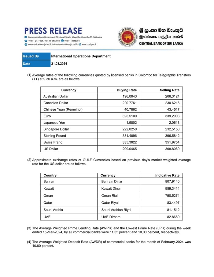 இலங்கை மத்திய வங்கியின் (CBSL) இன்றைய உத்தியோகபூர்வ நாணய மாற்று விகிதங்களின்படி, அமெரிக்க டொலரின் கொள்வனவு வீதம் மேலும் ரூ. 299.13 முதல் ரூ. 299.04.