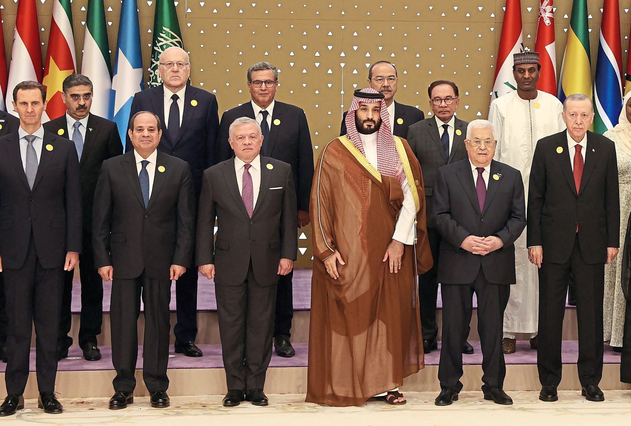 TOPSHOT - Anwar (fourth from right) posing ahead of an emergency meeting of the OIC with heads of state including Prince A handout picture taken and released on November 11, 2023 by Turkish presidential press service shows Syria's President Bashar al-Assad (L), Egypt's President Abdel Fatah al-Sisi,(first row 2ndL) Jordan's King Abdullah II (first row 3rdL), Saudi Crown Prince Mohammed bin Salman'(first row 3rdR), Palestinian Authority president Mahmud Abbas (first row 2ndR) and Turkish President Recep Tayyip Erdogan (R) posing ahead of an emergency meeting of the Arab League and the Organisation of Islamic Cooperation (OIC), in Riyadh on November 11, 2023. Arab leaders and Iran's president meeting in the Saudi capital Saturday roundly condemned Israel's actions in its war against Hamas in Gaza, as fears mount the conflict could draw in other countries. Thousands of civilians, both Palestinians and Israelis, have died since October 7, 2023, after Palestinian Hamas militants based in the Gaza Strip entered southern Israel in an unprecedented attack triggering a war declared by Israel on Hamas with retaliatory bombings on Gaza. (Photo by HANDOUT / TURKISH PRESIDENTIAL PRESS SERVICE / AFP) / RESTRICTED TO EDITORIAL USE - MANDATORY CREDIT 'AFP PHOTO / TURKISH PRESIDENTIAL PRESS SERVICE ' - NO MARKETING - NO ADVERTISING CAMPAIGNS - DISTRIBUTED AS A SERVICE TO CLIENTS