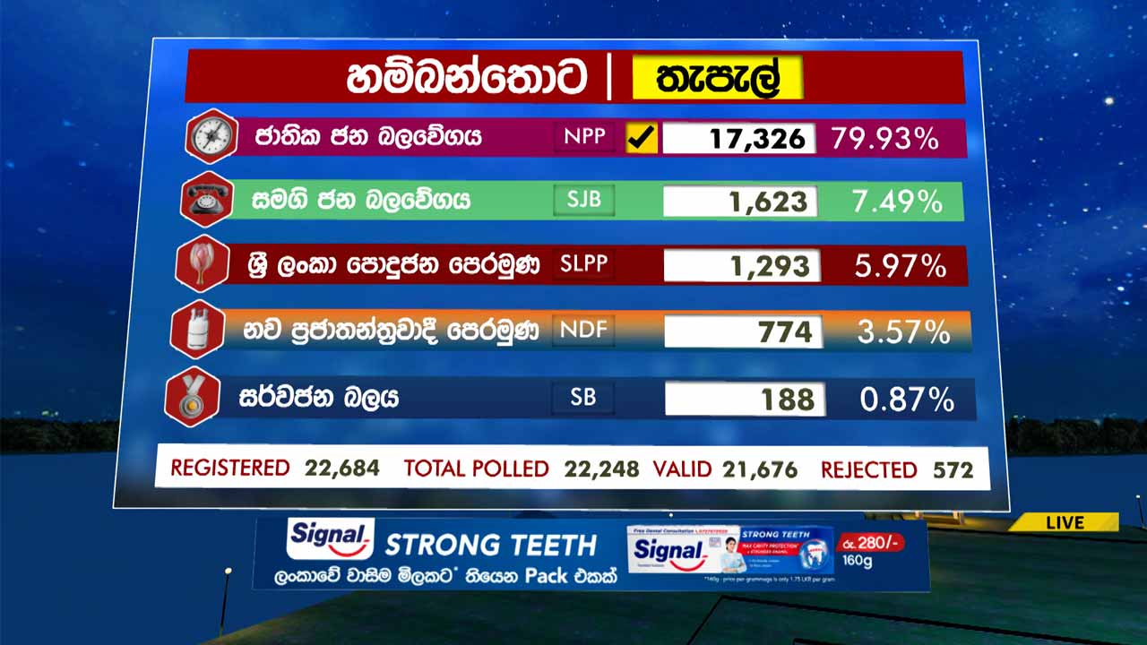 அதன்படி, ஹம்பாந்தோட்டை மாவட்டத்திற்கான தபால் மூல வாக்கெடுப்பில் தேசிய மக்கள் சக்தி (NPP) கட்சி வெற்றி பெற்றுள்ளது.