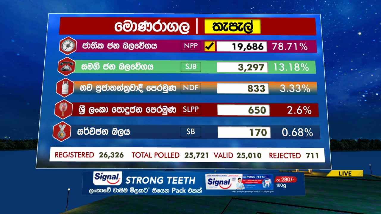 அதன்படி, மொனராகலை மாவட்டத்திற்கான தபால் மூல வாக்கெடுப்பில் தேசிய மக்கள் சக்தி (NPP) கட்சி வெற்றி பெற்றுள்ளது.