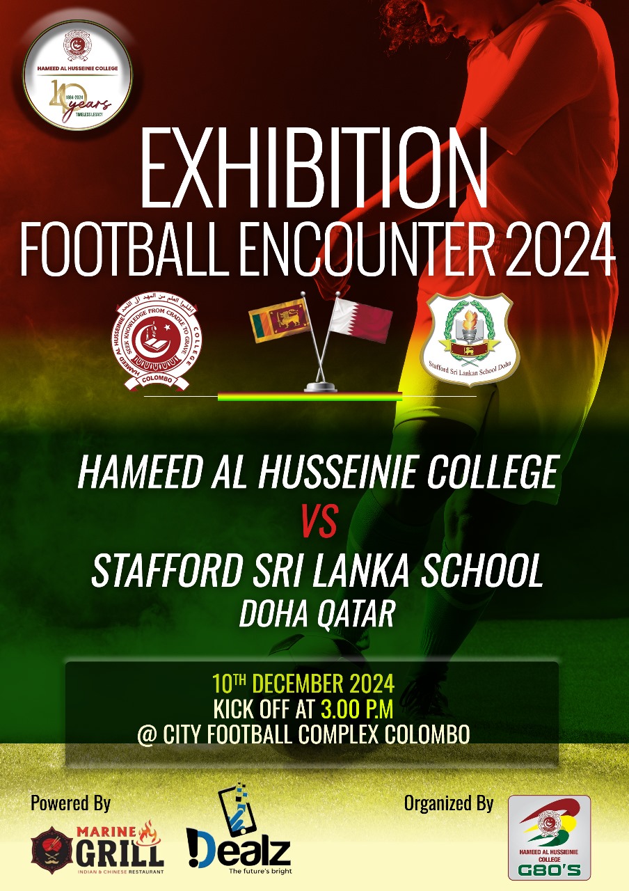 ஹமீத் அல் ஹுசைனியா கல்லூரி மற்றும் கத்தாரின் புகழ்பெற்ற ஸ்டாஃபோர்ட் ஸ்ரீலங்கா (தோஹா) அணிகள் மோதும் 2024 கால்பந்தாட்டப் போட்டி வெகுவிமர்சனத்துடன் நடைபெற இருக்கிறது.