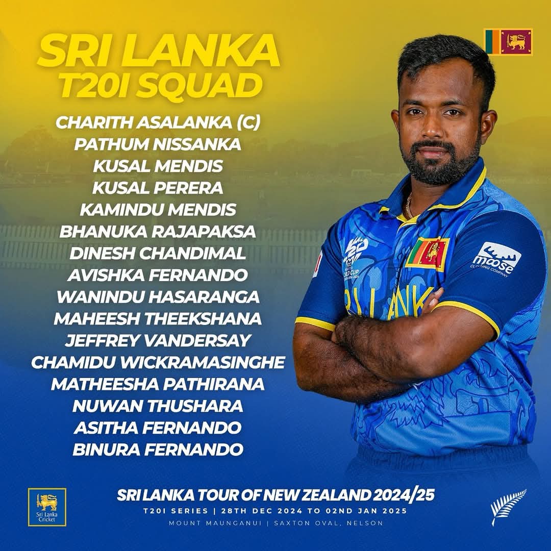 எதிர்வரும் டிசம்பர் 28, 30 மற்றும் ஜனவரி 2 ஆகிய திகதிகளில் நடைபெறும் 3 போட்டிகள் கொண்ட தொடரில் சரித் அசலங்க அணித் தலைவராக செயற்படுவார்.