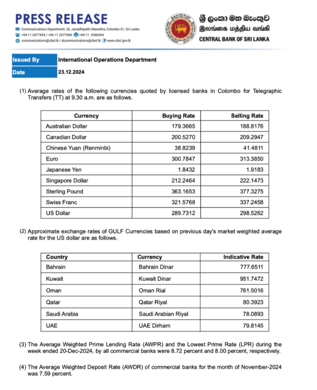 கடந்த வாரத்துடன் ஒப்பிடுகையில் இன்று (டிசம்பர் 23) அமெரிக்க டொலருக்கு நிகரான இலங்கை ரூபாவின் பெறுமதி வீழ்ச்சியடைந்துள்ளது. இலங்கை மத்திய வங்கியின் கூற்றுப்படி, அமெரிக்க டொலரின் கொள்வனவு வீதம் ரூ. 289.73 மற்றும் விற்பனை விலை ரூ. 298.52.