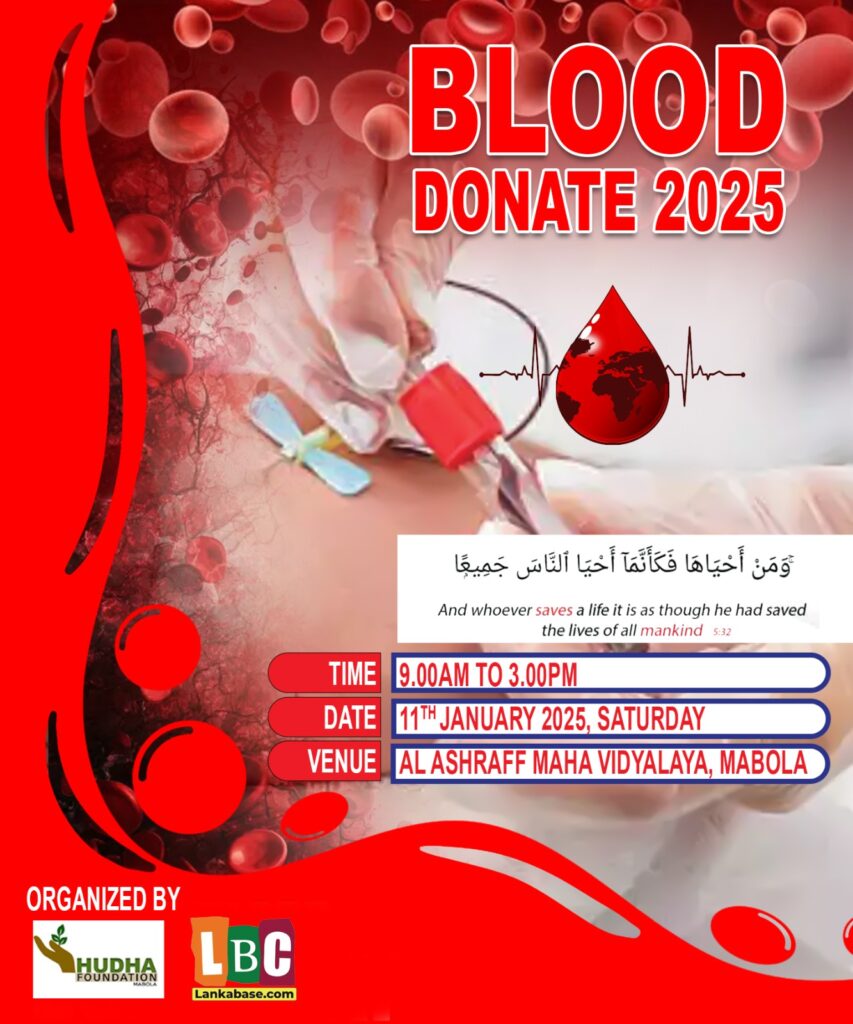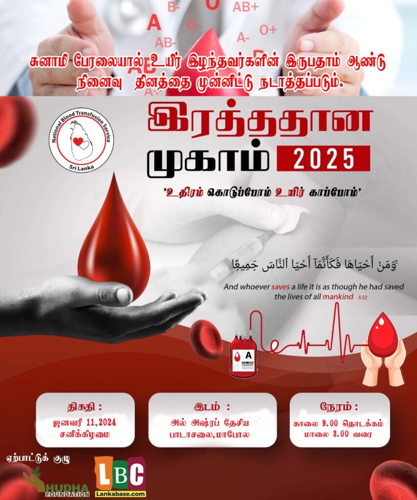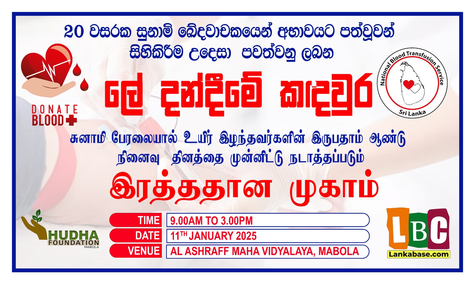 2004ஆம் ஆண்டில் நிகழ்ந்த சுனாமி பேரழிவின் 20ஆம் ஆண்டு நினைவாக லங்காபேஸ். காம் மற்றும் ஹுதா ஃபவுண்டேஷன் இணைந்து ஒரு சிறப்பு இரத்ததான முகாமை ஏற்பாடு செய்துள்ளன.