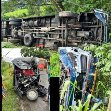 அப்போது, சாலையில் இருந்த மண் திட்டுடன் மோதி, பஸ் சில அடிகள் கீழே சாலையில் கவிழ்ந்ததாக பொலிஸார் தெரிவித்தனர். காயமடைந்தவர்களில் பஸ் மற்றும் முச்சக்கர வண்டியில் இருந்த நால்வர் அடங்குகின்றனர்.