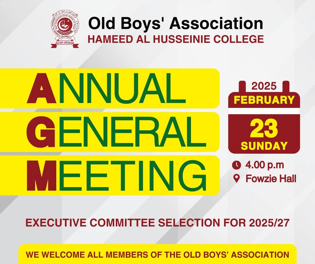 The Annual General Meeting (AGM) of the Old Boys’ Association of Hameed Al Husseinie College is scheduled to take place on Sunday, February 23, 2025, at 4:00 PM in Fowzie Hall.