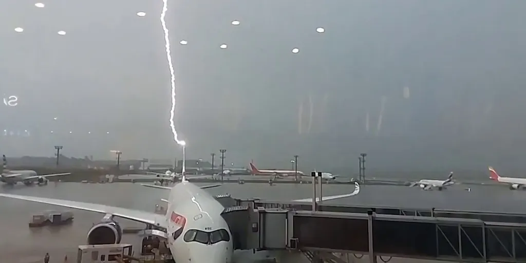 அப்போது, வானில் இருந்து மின்னல் ஒன்று விமானத்தின் வால் பகுதியை தாக்கியுள்ளது.இதனை விமான பயணியான பெர்ன்ஹார்டு வார் என்பவர் காணொளி எடுத்துள்ளார்.