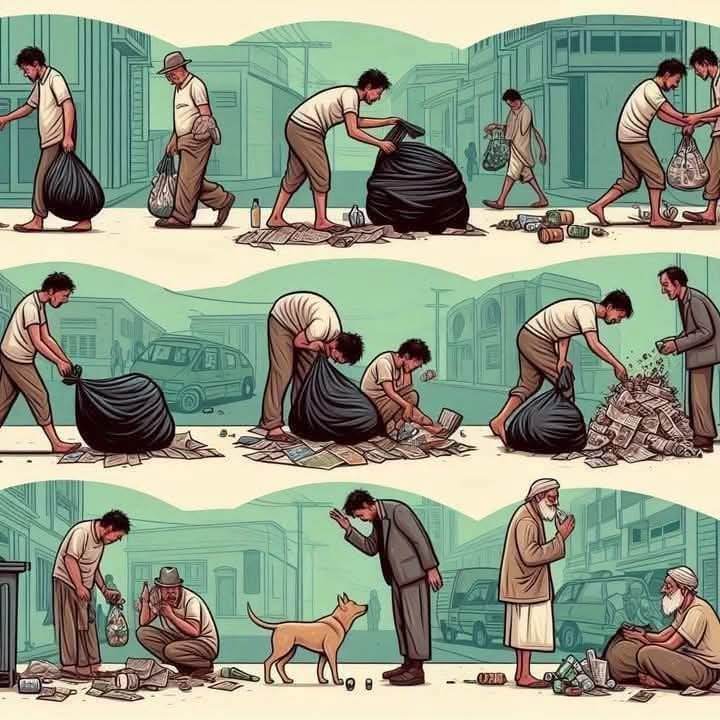 சிறிது நேரத்தில் இன்னொரு நபர் அதே குப்பைத் தொட்டியில் தனக்குத் தேவையான பாட்டில்களை நிரப்பி எடுத்துச் சென்றார். மீண்டும் ஒருவர் தனக்குத் தேவையான பழைய பிளாஸ்டிக் தட்டு, பேப்பரை எடுத்து சாக்கில் நிரப்பிச் சென்றார். அதன்பின் ஒரு நாய் வந்து எச்சில் இலையில் இருந்த சாப்பாட்டை சாப்பிட்டுச் சென்றது.