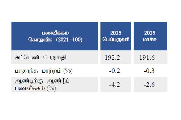 உணவில்லா பணச்சுருக்கம் 2025 பெப்ரவரி மாதத்தில் பதிவாகியிருந்த 6.1 சதவீதம் என்பதிலிருந்து மார்ச் மாதத்தில் 4.1 சதவீதமாக வீழ்ச்சியடைந்திருந்தது. உணவு வகைகளுக்கான பணச்சுருக்கம் 2025 பெப்ரவரி மாதத்தில் 0.2 சதவீதமாக காணப்பட்ட நிலையில், மார்ச் மாதத்தில் 0.6 சதவீத பணவீக்கமாக உயர்ந்திருந்தது.