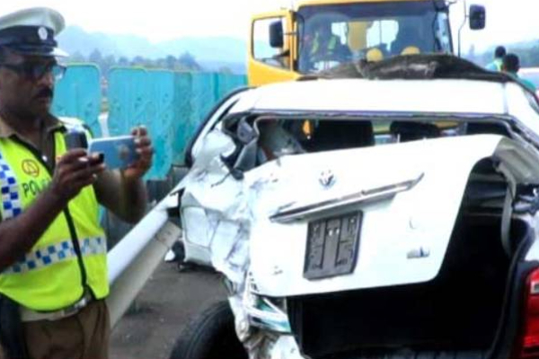 அதேநேரம், பின்னால் வந்த காரும் வேன் மீது மோதியதுடன், விபத்தில் பாதுகாப்பு வேலியும் சேதமடைந்துள்ளது. இந்த விபத்தில் இரண்டு வெளிநாட்டவர்கள் உட்பட நால்வர் காயமடைந்துள்ளதாகவும் தெரிவிக்கப்படுகின்றது.