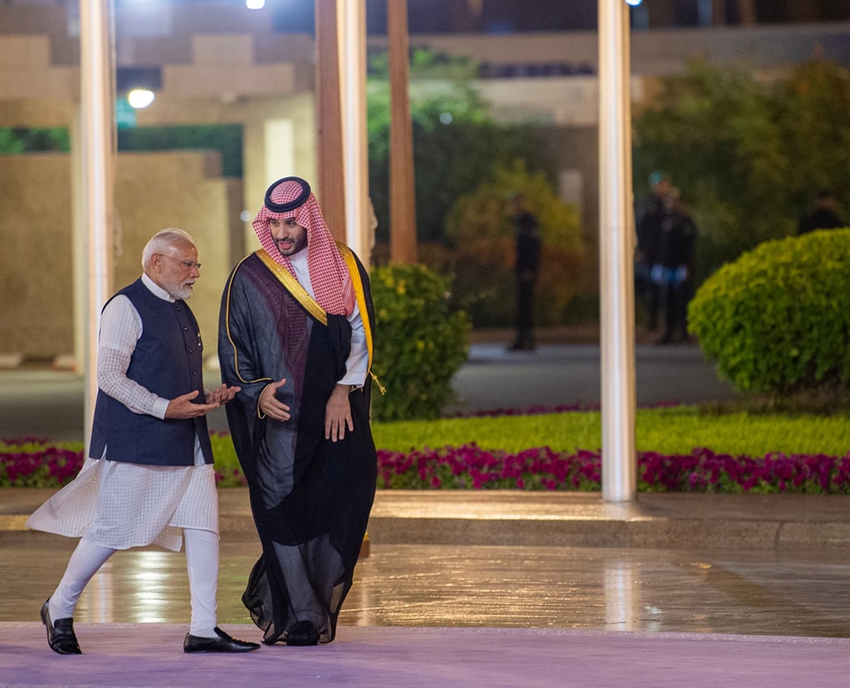 ஜித்தாவில் உள்ள அல்-சலாம் அரண்மனையில் இந்தியப் பிரதமர் மோடியை சவுதி பட்டத்து இளவரசர் மொஹமட் பின் சல்மான வரவேற்கிறார்.