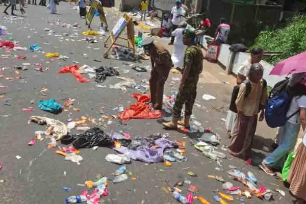 ஸ்ரீ தலதா மாளிகையை சுற்றியுள்ள வீதிகளில் குப்பைகள் சிதறிக்கிடக்கின்றன, பொலிதீன் பைகள், பிளாஸ்டிக் போத்தல்கள் மற்றும் உணவுப் பொதி பெட்டிகள் கடுதாசிகள் என குப்பைகளாக உள்ளன.