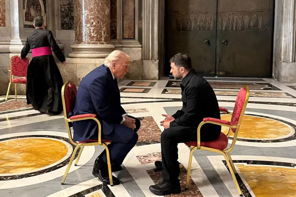 புனித பாப்பரசர் பிரான்சிஸின் இறுதிச் சடங்கு தொடங்குவதற்கு சில நிமிடங்களுக்கு முன்பு, செயிண்ட் பீட்டர்ஸ் பசிலிக்காவில் அமெரிக்க ஜனாதிபதி ட்ரம்ப் மற்றும் உக்ரைன் ஜனாதிபதி ஜெலென்ஸ்கி இருவரும் முக்கிய கலந்துரையாடலில் ஈடுபட்டுள்ளனர்.