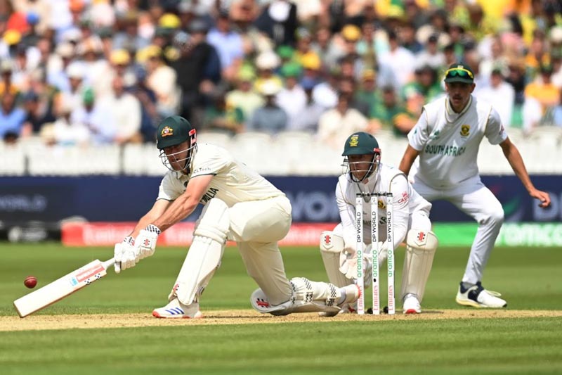 அந்தவகையில் முதலில் துடுப்பெடுத்தாடிய அவுஸ்திரேலியா ஆரம்பத்திலேயே உஸ்மான் கவாஜா, கமரன் கிறீனை ககிஸோ றபாடாவிடம் இழந்து தடுமாறியது. பின்னர் மர்னுஸ் லபுஷைனும், ஸ்டீவன் ஸ்மித்தும் ஓட்டங்களைச் சேர்த்த நிலையில் மார்கோ ஜன்சனிடம் லபுஷைன் வீழ்ந்தார். சிறிது நேரத்தில் அடுத்து வந்த ட்ரெவிஸ் ஹெட்டும் ஜன்சனிடம் வீழ்ந்தார்.