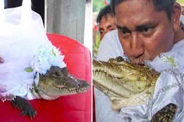 முதலைக்கு மணப்பெண் போல உடை உடுத்தி, மேளதாளங்கள் முழங்க கோலாகலமாக திருமணம் நடைபெற்றுள்ளது.