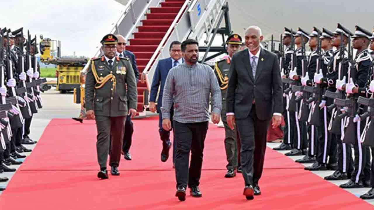 மாலைதீவு தேசிய பாதுகாப்புப் படையின் மரியாதைக்கு மத்தியில், மாலைதீவு ஜனாதிபதி முகமது முய்சு ஜனாதிபதியை அன்புடன் வரவேற்றார்.